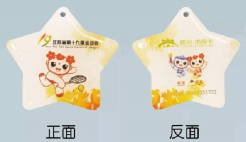省運(yùn)會(huì)紀(jì)念卡包括兩種普通卡、兩種異形卡。普通卡的大小與普通市民卡的大小形狀相似,只是封面有所不同:正面左下角,省運(yùn)會(huì)吉祥物“歡歡”“樂(lè)樂(lè)”舉著火炬,面帶微笑,奔跑而來(lái);背景呈現(xiàn)瓊花花瓣的外形,右上角有“19”“揚(yáng)州”和“江蘇省第十九屆運(yùn)動(dòng)會(huì)”文字。其背面有跳躍的“歡歡”造型和“全民動(dòng)起來(lái)江蘇更精彩”的文字。兩種普通卡的區(qū)別在于背景色有所不同。