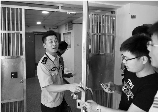 社區(qū)民警在單元樓內(nèi)巡查,并告訴租戶盡快辦理門禁卡。