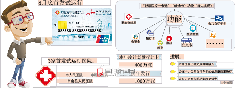 至8月底,阜陽市將在市人民醫(yī)院、市腫瘤醫(yī)院和阜南縣人民醫(yī)院3家醫(yī)院首發(fā)并試運行此卡,首先實現(xiàn)此卡原有的“智慧醫(yī)療一卡通(就診卡)”在市內(nèi)的功能。