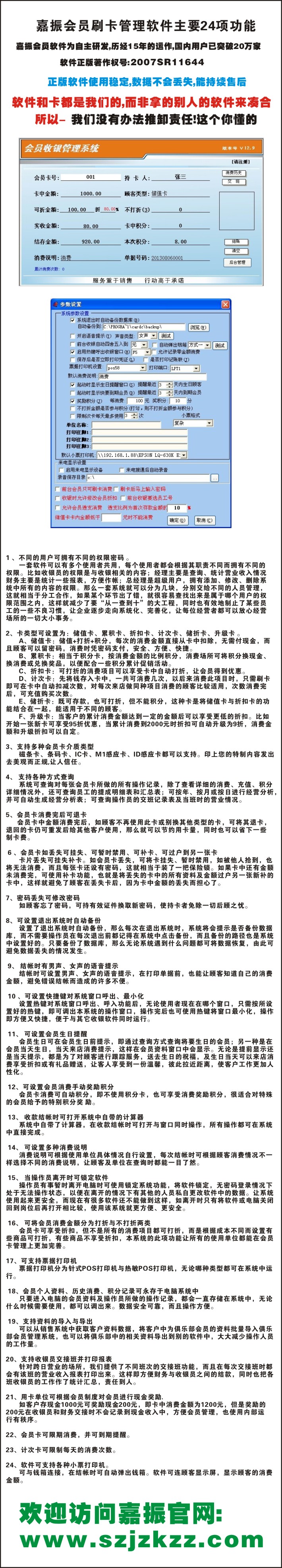 可發(fā)行:儲值卡、折扣卡、升級卡、積分卡、計次卡、儲折卡、集團卡(子母卡)等多種會員卡類型,可兼容IC卡、磁條卡、條碼卡、M1卡、ID感應卡。且會員消費可自動積分、自動升級,讓您的操作實現(xiàn)電腦自動化管理。